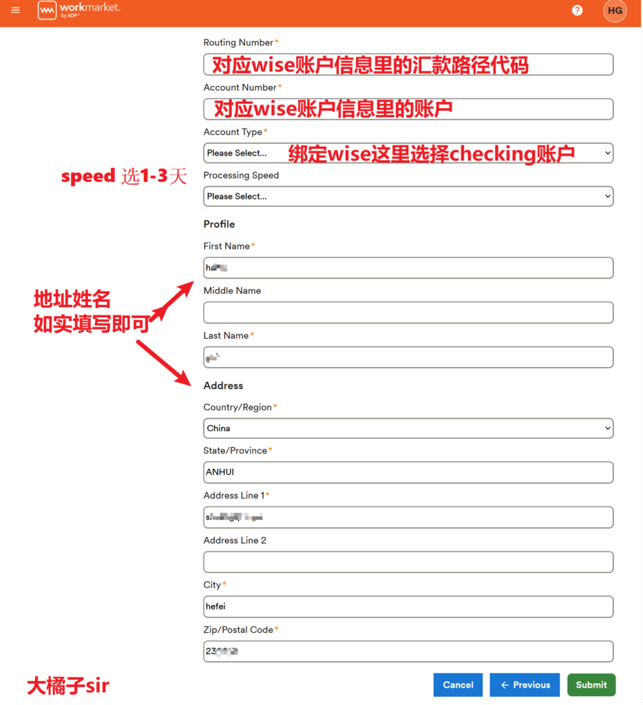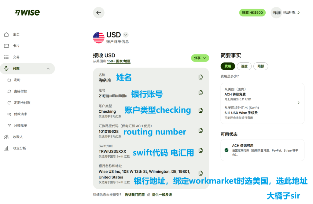 2. 这里是你详细的USD收款信息,可以填写到workmarket里
